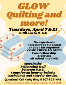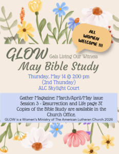 Please join us in person in the Meeting Room across from the ALC office or via Zoom for our GLOW Women’s BIBLE STUDY every 2nd Thursday of the month at 2 PM. These Bible studies come from the Gather Magazine. All Women are welcome! Come enjoy an afternoon of fun!